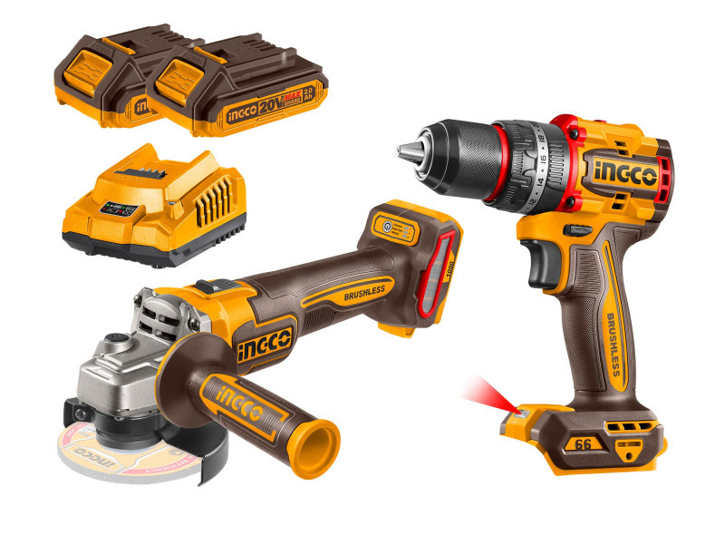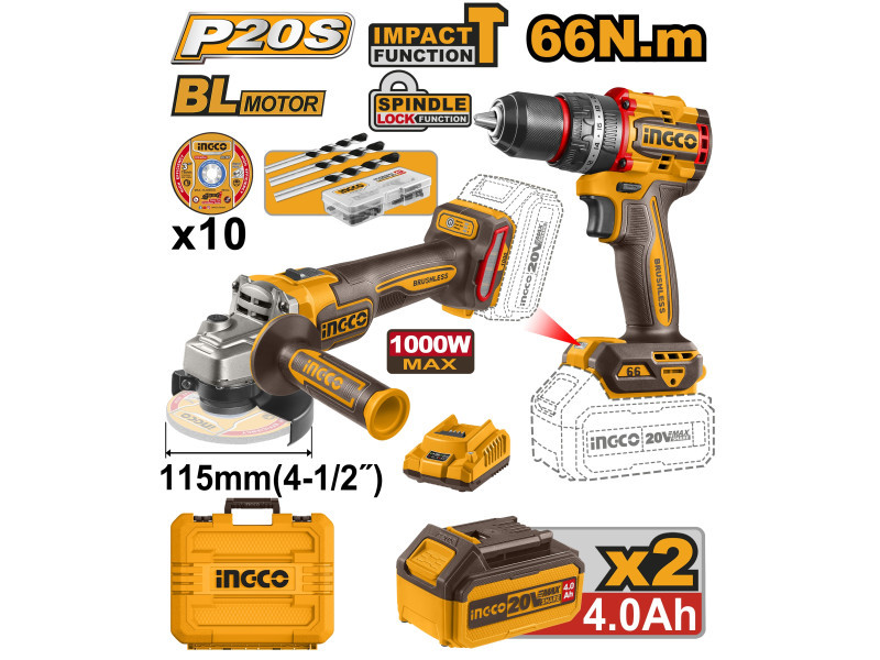 INGCO Akkus erőcsomag 20 V Ütvefúró-csavarozó 66 Nm+Sarokcsiszoló 115 mm (2 db akku + töltő)