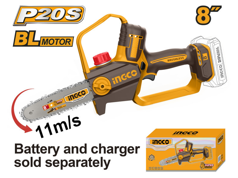 INGCO Akkus láncfűrész 200 mm szénkefe nélküli 20 V (akku és töltő nélkül)