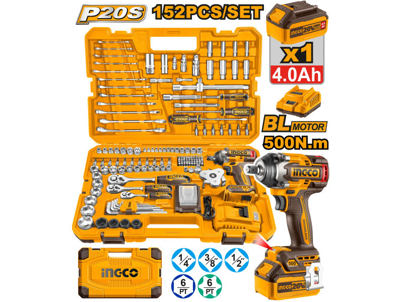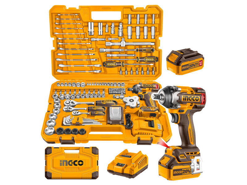 INGCO Akkus ütvecsavarozó 500 Nm szénk. nélk. 20 V (1 x 4,0 Ah akku + töltő) + 149 r. szersz. klt