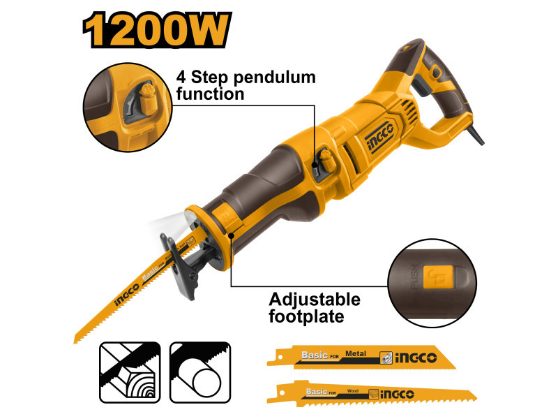Az INGCO RS12001 nagy teljesítményű, 1200 W-os elektromos szablyafűrész, amelyet úgy terveztek, hogy különféle anyagok (mint fa, fém és alumínium) vágására is alkalmas legyen.