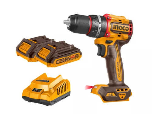 INGCO Akkus ütvefúró-csavarozó 66 Nm szénkefe nélküli 20 V (2 x 2,0 Ah akku + töltő)