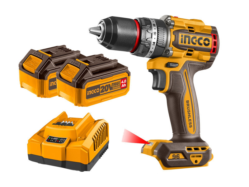 INGCO Akkus ütvefúró-csavarozó 96 Nm szénkefe nélküli 20 V (2 x 4,0 Ah akku + töltő)