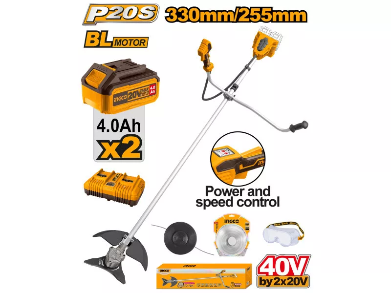 INGCO Akkus fűkasza 330 mm szénkefe nélküli 2 x 20 V (2 x 4,0 Ah akku + töltő)